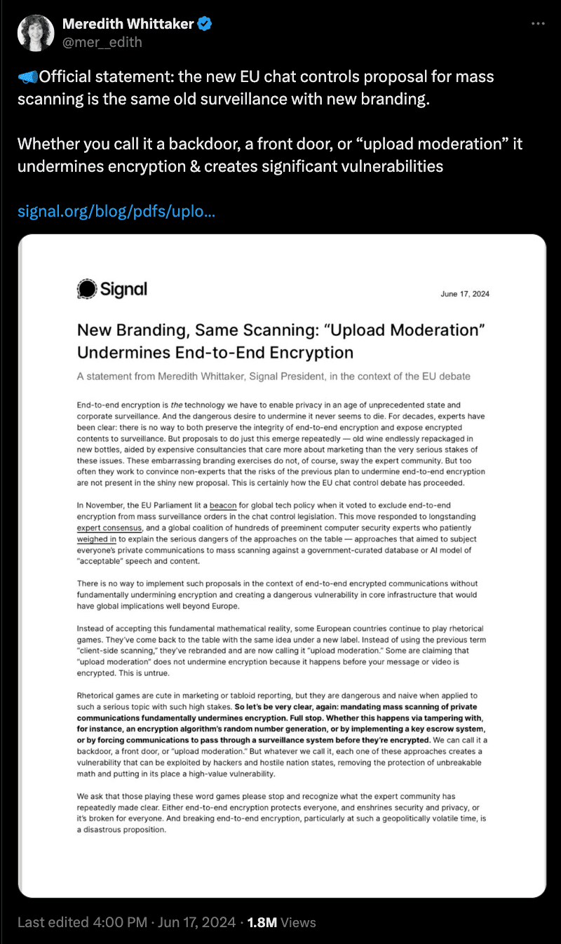 Whittaker has called the legislation “the same old surveillance with new branding,” highlighting that terms like “upload moderation” are just euphemisms for creating backdoors in encrypted systems. She warns that these backdoors, no matter how they're framed, would introduce vulnerabilities that could be exploited by hackers and hostile nation-states, effectively dismantling the protections offered by end-to-end encryption. Signal has even threatened to cease operations in the EU if the law passes, underscoring the seriousness of the issue.