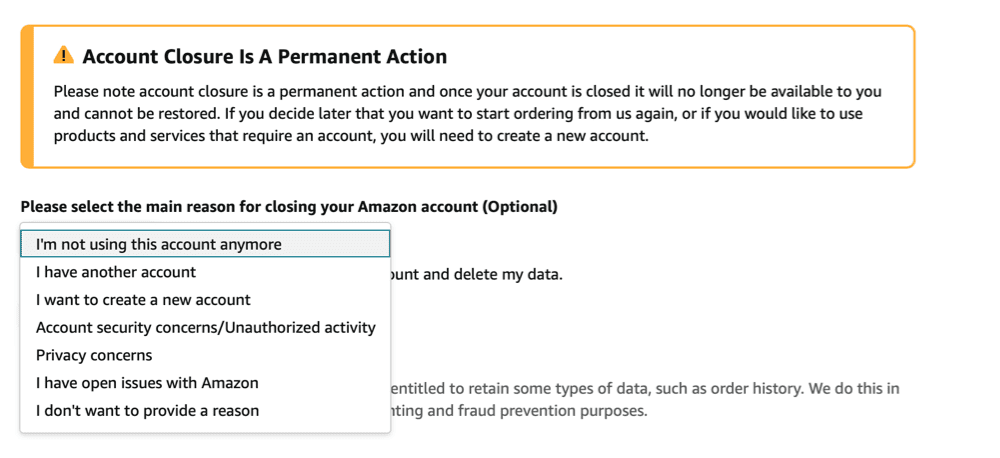 While you won’t have access to your data and history after deleting your account, it’s worth noting that Amazon retains some of your data. This includes data that it has to keep to meet legal obligations, such as customer names, purchased products, VAT information, and more. Amazon may also keep limited personally identifying information after account closure.