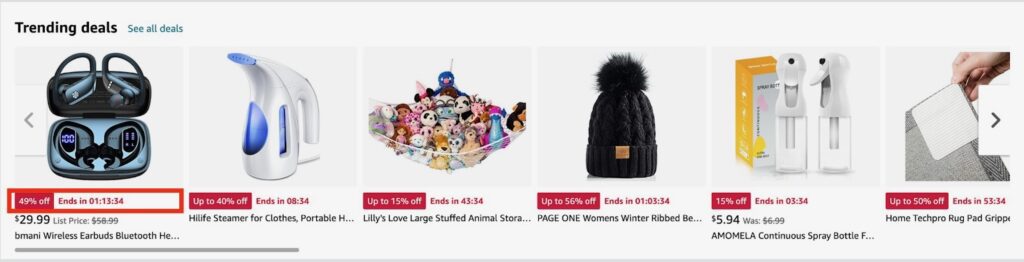 Countdowns schaffen Dringlichkeit für zeitlich begrenzte Angebote. Manchmal werden sie auch dann eingesetzt, wenn es kein wirkliches Zeitlimit gibt (z. B., wenn das Angebot einfach verlängert wird, sobald die Zeit abgelaufen ist). Bei dieser Taktik wird mit der natürlichen menschlichen Reaktion auf Knappheit gespielt und Kunden werden ermutigt, schnell zu handeln, um nichts zu verpassen. Online-Händler verwenden oft Countdown-Timer bei Verkaufsaktionen, um schnelle Käufe zu fördern.