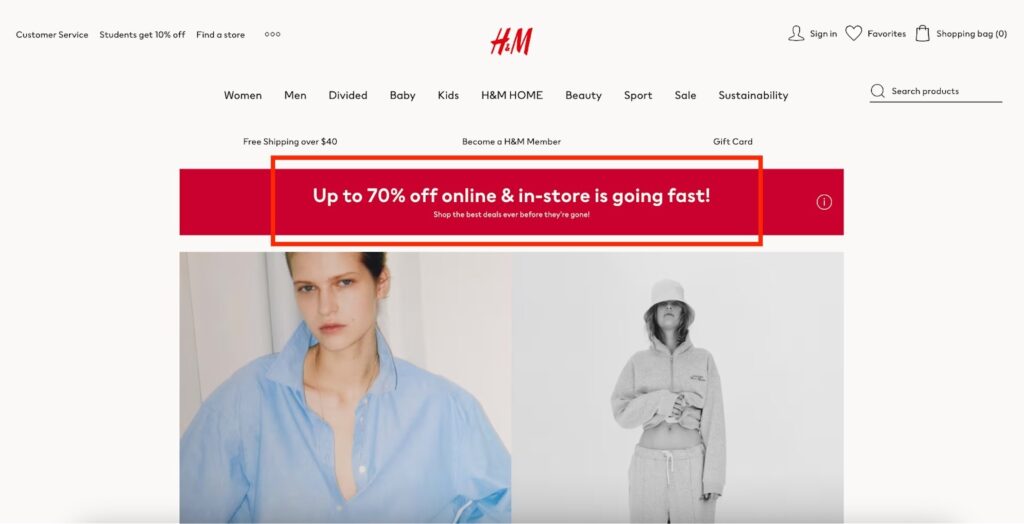 Hierbei handelt es sich um zeitlich begrenzte Aktionen, die Dringlichkeit erzeugen und Kunden zum schnellen Kauf anregen. Fast-Fashion-Websites wie ASOS, Shein und H&M haben sich auf Flash-Sales spezialisiert und bieten für eine begrenzte Zeit Angebote für Produkte und Dienstleistungen an.