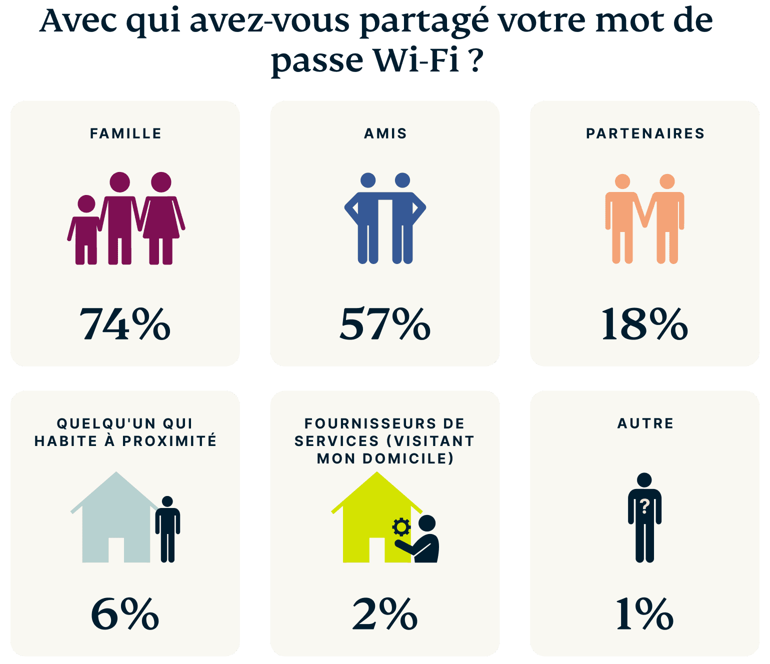 Alors, à qui donne-t-on le plus souvent le mot de passe de son réseau Wi-Fi ? Nos données révèlent que les personnes interrogées sont plus enclines à partager leur Wi-Fi avec des proches, tels que des parents (74 %) et des amis (57 %). Il est intéressant de noter que 18 % seulement partagent leur Wi-Fi avec leurs partenaires.