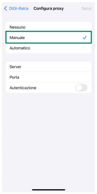 - Inserisci l'indirizzo del server proxy e il numero di porta fornito dal servizio, quindi premi Salva.