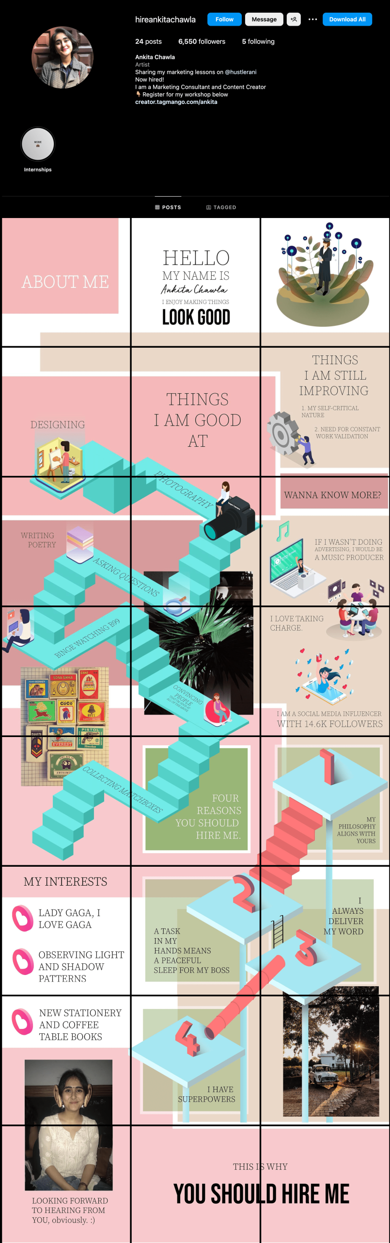 Ad esempio, Ankita Chawla, un'utente con sede in India, ha trasformato il proprio account Instagram personale in una vetrina creativa delle sue capacità e abilità. Ha progettato il curriculum come un collage e lo ha pubblicato sul proprio profilo, il che l'ha portata ad essere assunta come visual creator presso Deloitte India.