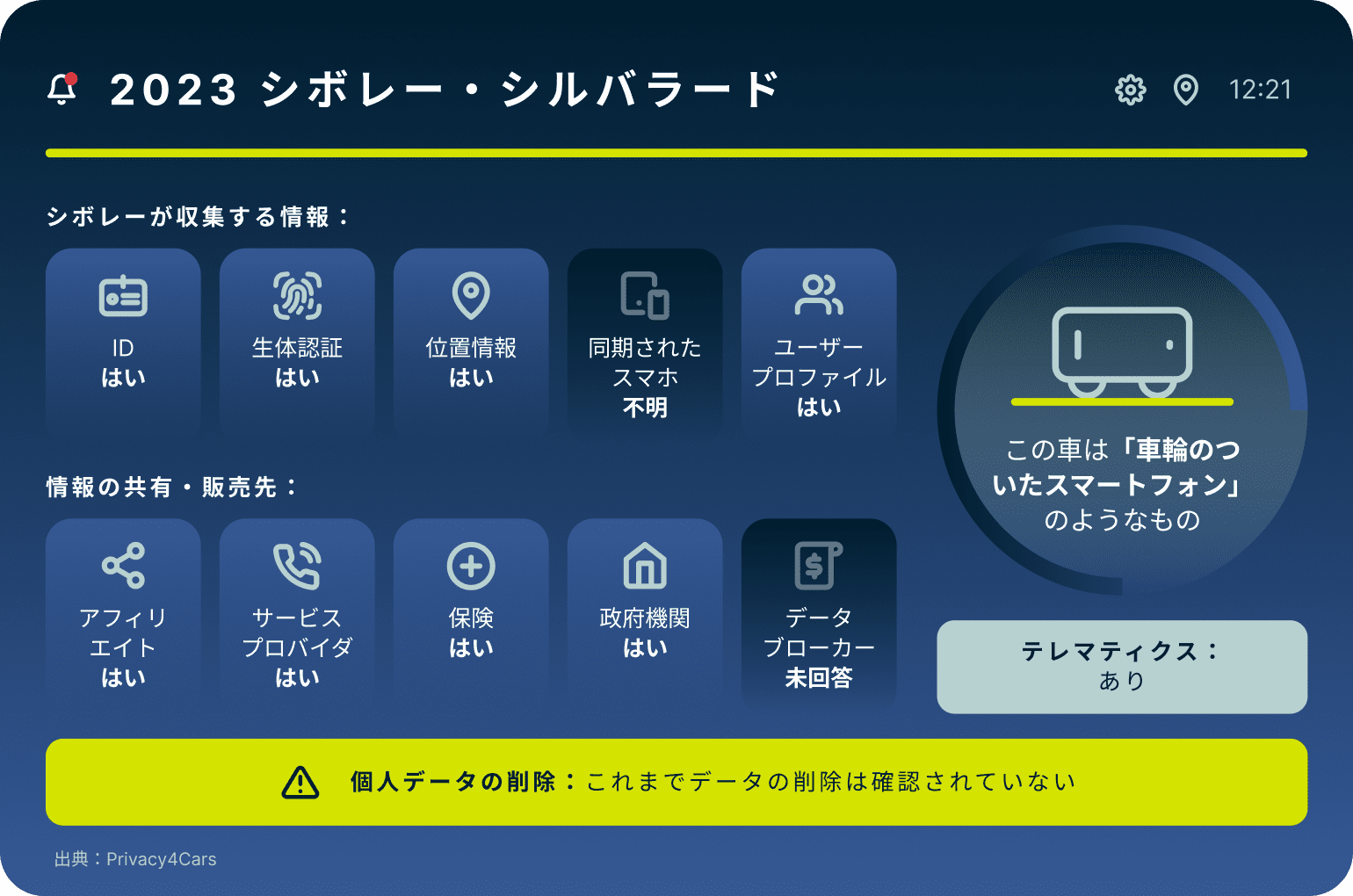 - 米国を拠点とする車両のプライバシー技術企業であるPrivacy4Carsは今年初め、自動車によるデータ収集の範囲をドライバーに通知するためのツール「Vehicle Privacy Report」を導入した