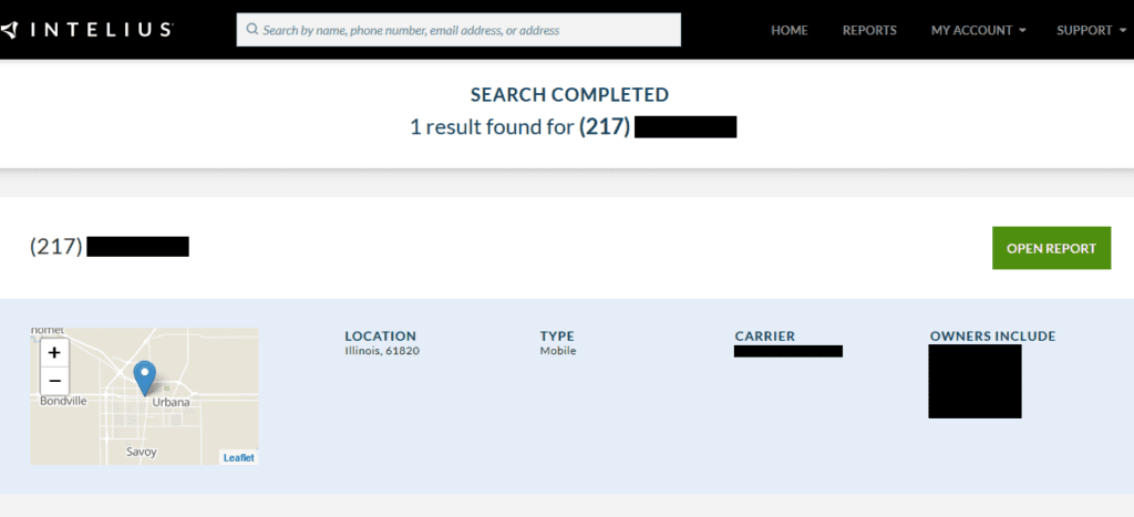 Reverse lookup results on Intelius from phone number. Source: Princeton University