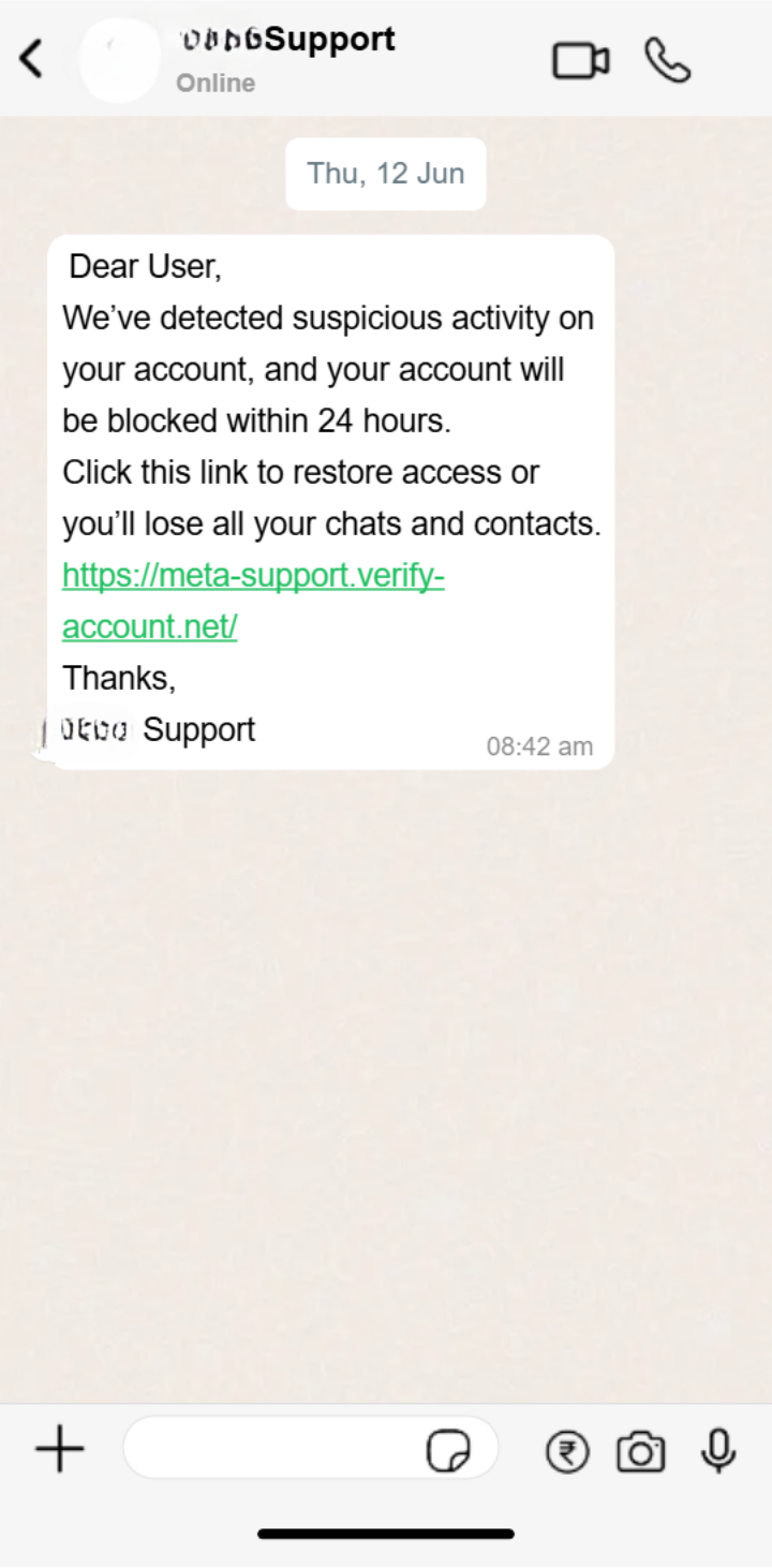 A message, often with a fake WhatsApp or Meta logo, claims there is a problem with your account (e.g., “suspicious activity detected” or “your version is outdated”). It instructs you to click a link to verify your identity or update the app to avoid account suspension. The link leads to a phishing page to steal your login credentials.