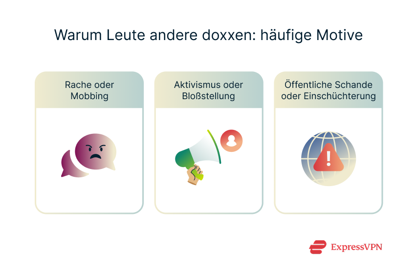 Doxxing wird häufig benutzt, um sich an jemandem zu rächen, etwa an einem früheren Freund, einem Ex oder einem Rivalen aus einem Online-Streit. Das Veröffentlichen privater Daten einer Person kann dazu führen, dass sie sich bloßgestellt, verletzlich und unsicher fühlt.
