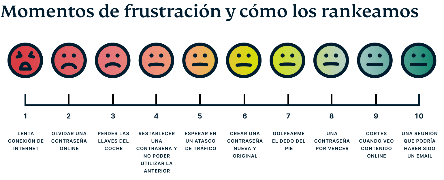 La mayoría de los encuestados (35%) indicaron que una conexión lenta a internet es lo único que consideran más desesperante que olvidar una contraseña. Esta frustración aumenta cuando restablecen una contraseña y justo después les dicen que no puede ser igual que la anterior (25%).