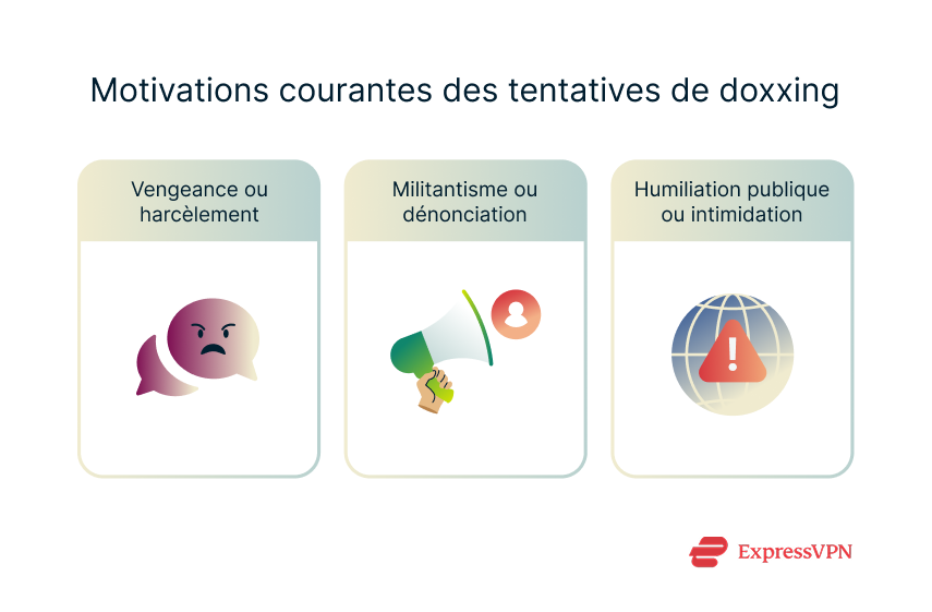 Dans certains cas, le doxxing est personnel, il vise à blesser ou à humilier. Dans d’autres cas, il est utilisé pour dénoncer quelqu’un ou faire passer un message. Quelle que soit la raison, l’objectif est généralement le même : exercer une pression sur quelqu’un en divulguant ses informations privées.
