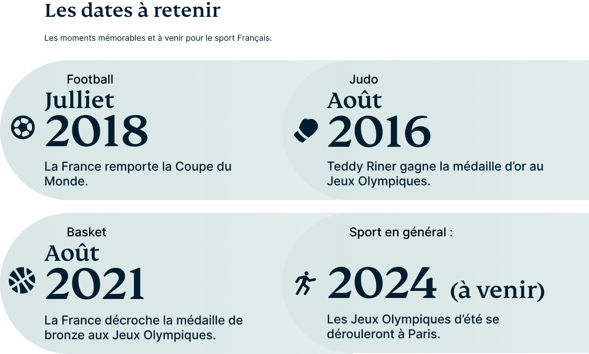 De nombreuses dates ont marqué le sport français au cours de la dernière décennie avec des événements passionnants, et parmi ceux-ci, on peut noter la victoire aux Jeux olympiques du judoka professionnel français Tedy Rinner. De plus, la France a remporté la coupe du monde fin 2016, accompagnée d'une médaille de bronze aux Jeux olympiques pour l'équipe de France. Enfin, les prochains Jeux Olympiques d'été se tiendront à Paris, témoignant d'un intérêt prometteur de la part des Français.