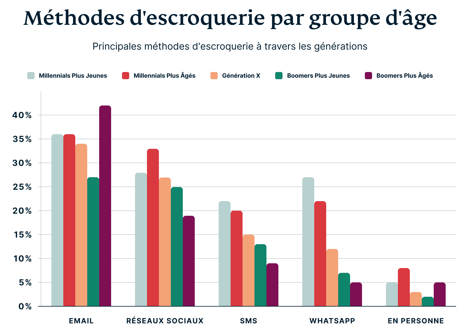 Les réseaux sociaux ne sont pas loin derrière en tant que terrain propice aux arnaques, en particulier à mesure que les adultes plus âgés deviennent plus actifs sur des plateformes comme Facebook. Selon notre enquête, 27 % des victimes d'escroquerie de la génération X, 25 % des jeunes victimes d’escroquerie chez les baby-boomers et 19 % des victimes d’escroquerie chez les boomers plus âgés sont tombés dans le piège des arnaques sur les réseaux sociaux.