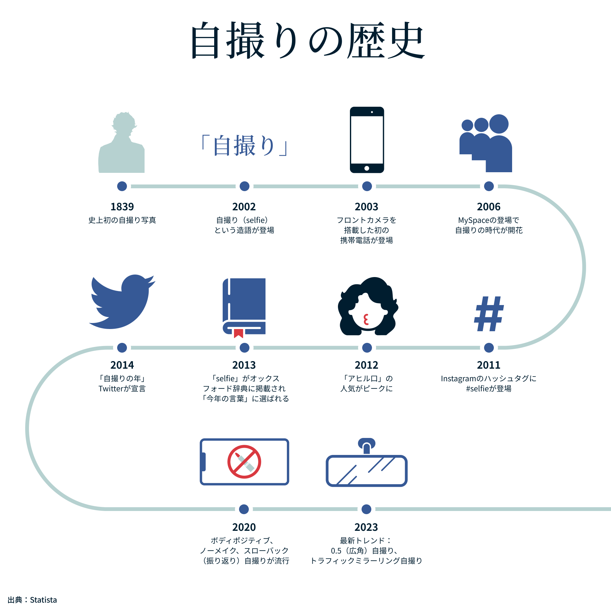 1839年、ロバート・コーネリアスが世界初の自撮り写真を撮影したのを皮切りに、セルフィーの概念は大きく発展してきました。しかし、自撮りが本格的に普及し、私たちの文化に根付いたのは、スマホ、特にフロントカメラを搭載したスマホが登場してからです。