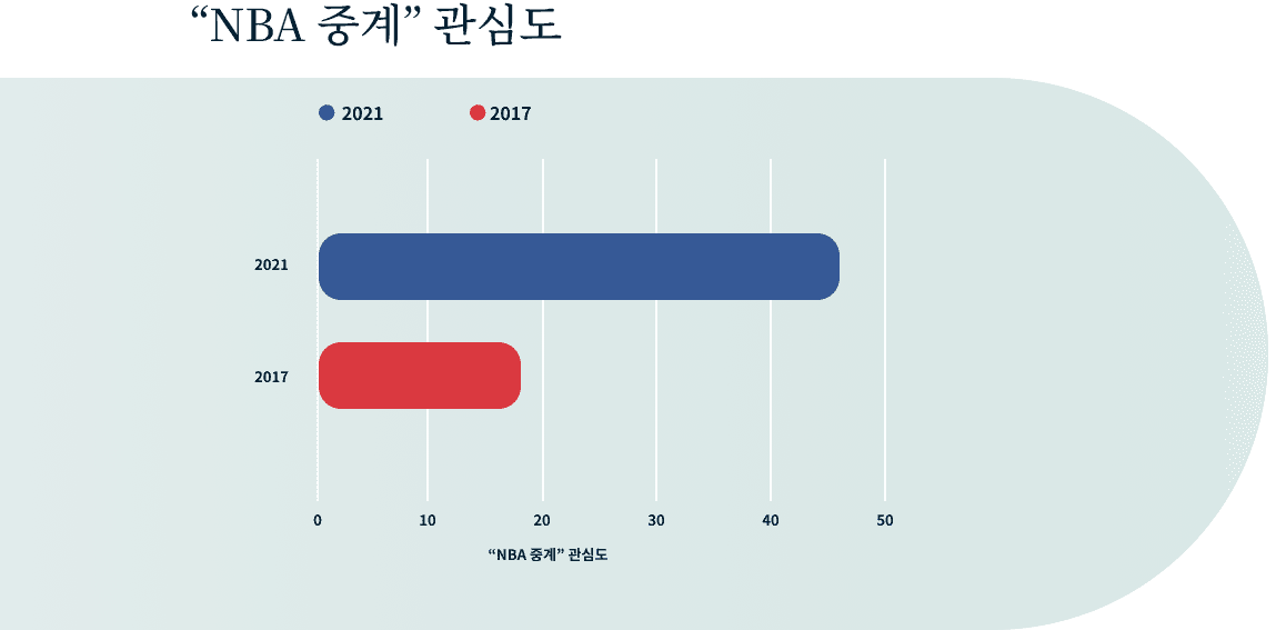 해외 농구 리그 중 가장 인기가 있는 NBA에 대한 관심도 또한 알아봤습니다. NBA 중계에 대한 검색량은 5년간 155%나 증가했습니다.