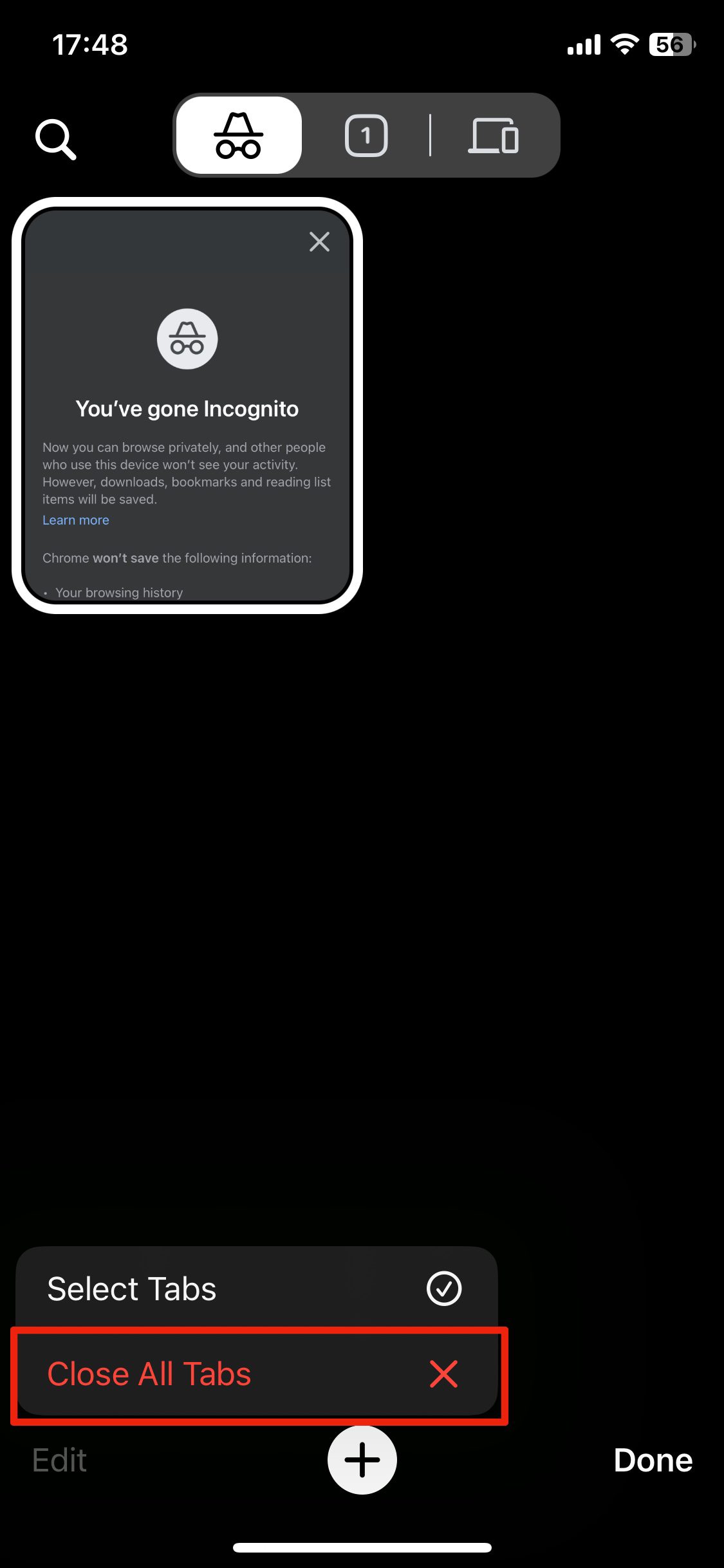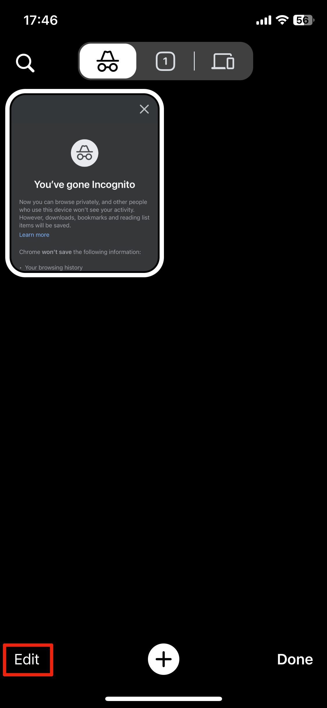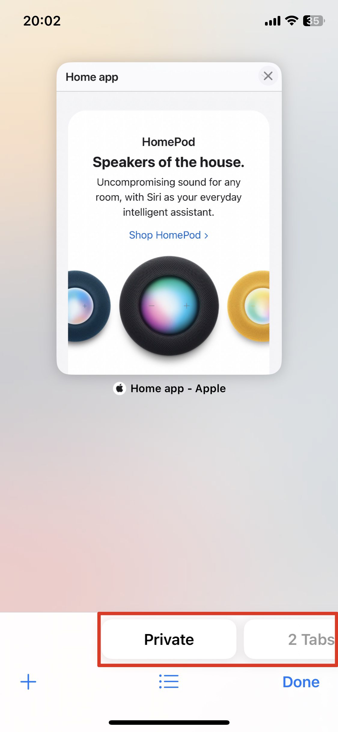 - 이제 열려 있는 탭이 표시됩니다. 화면 하단을 보시면 열려 있는 탭 수를 표시하는 버튼이 있습니다. 이 버튼을 오른쪽으로 스와이프하거나 회색으로 표시된 비공개 버튼을 탭하세요.