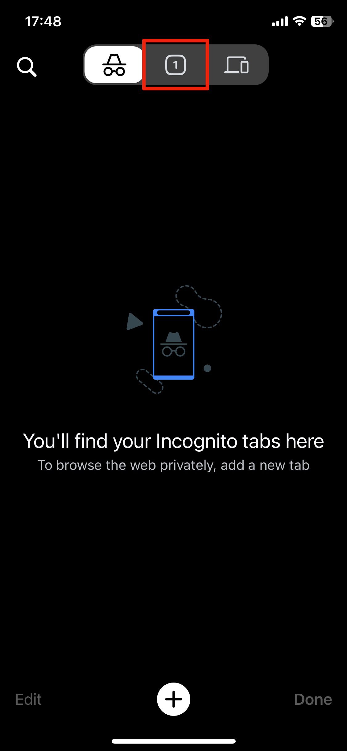 - 탭 버튼을 탭하면 브라우저가 시크릿 모드에서 일반 모드로 변경됩니다. 이제 탭 버튼은 화면 상단 중앙에 표시되며 열려 있는 일반 모드 탭 수를 나타내는 숫자가 표시됩니다.