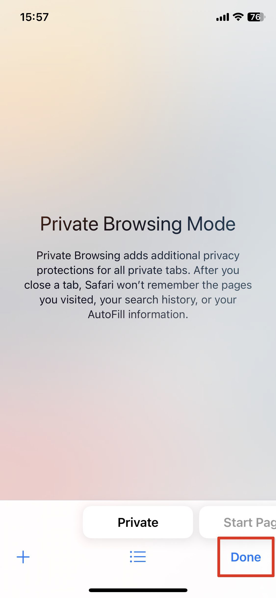 검색창/주소창을 확인하여 Safari에서 비공개 브라우징이 활성화되었는지 확인할 수 있습니다. 검색/주소창이 진한 회색으로 표시될 것입니다.