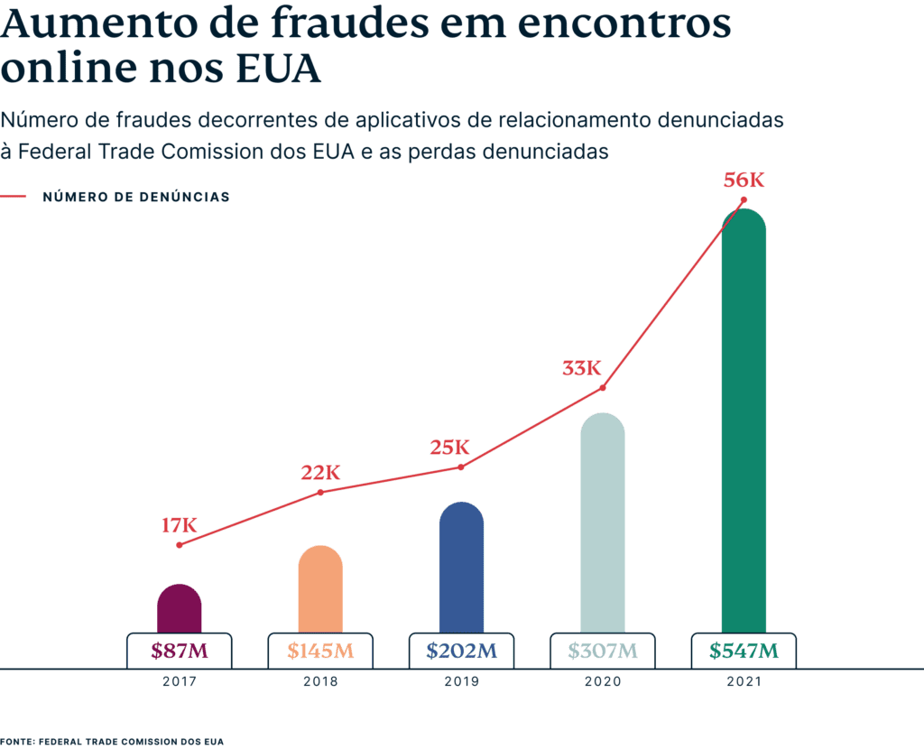 De fato, de acordo com um relatório sobre fraudes românticas divulgado pela Federal Trade Comission (FTC) dos E.U.A., estima-se que 547 milhões de dólares foram perdidos para golpistas do romance em 2021 — um aumento de 80% em comparação com o ano anterior e um número que só deverá aumentar à medida que mais usuários se cadastrem em sites de relacionamento online.