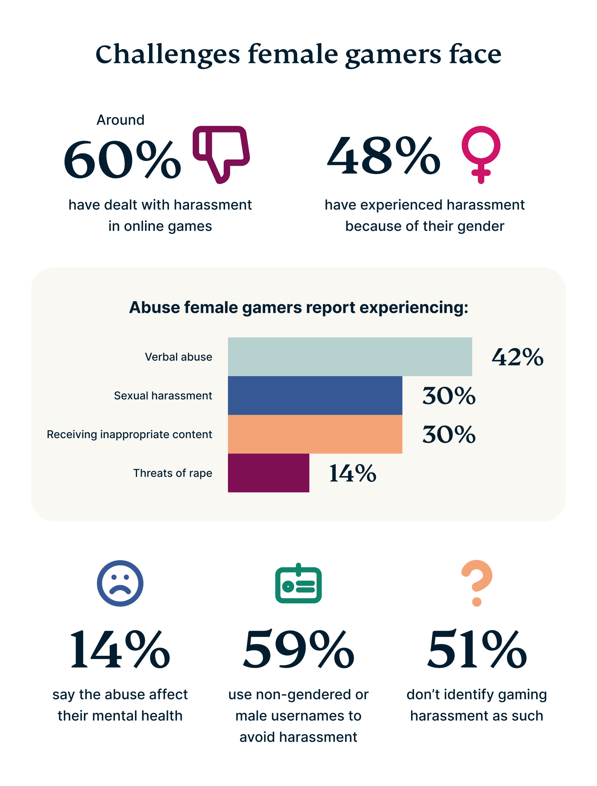 Apesar de mais mulheres se destacarem nos jogos, a comunidade continua enfrentando assédio e discriminação. Um relatório de 2023 da Liga Anti-Difamação (ADL) revelou que 48% das jogadoras experenciaram assédio especificamente por causa de seu gênero, marcando um leve aumento em relação aos anos anteriores.