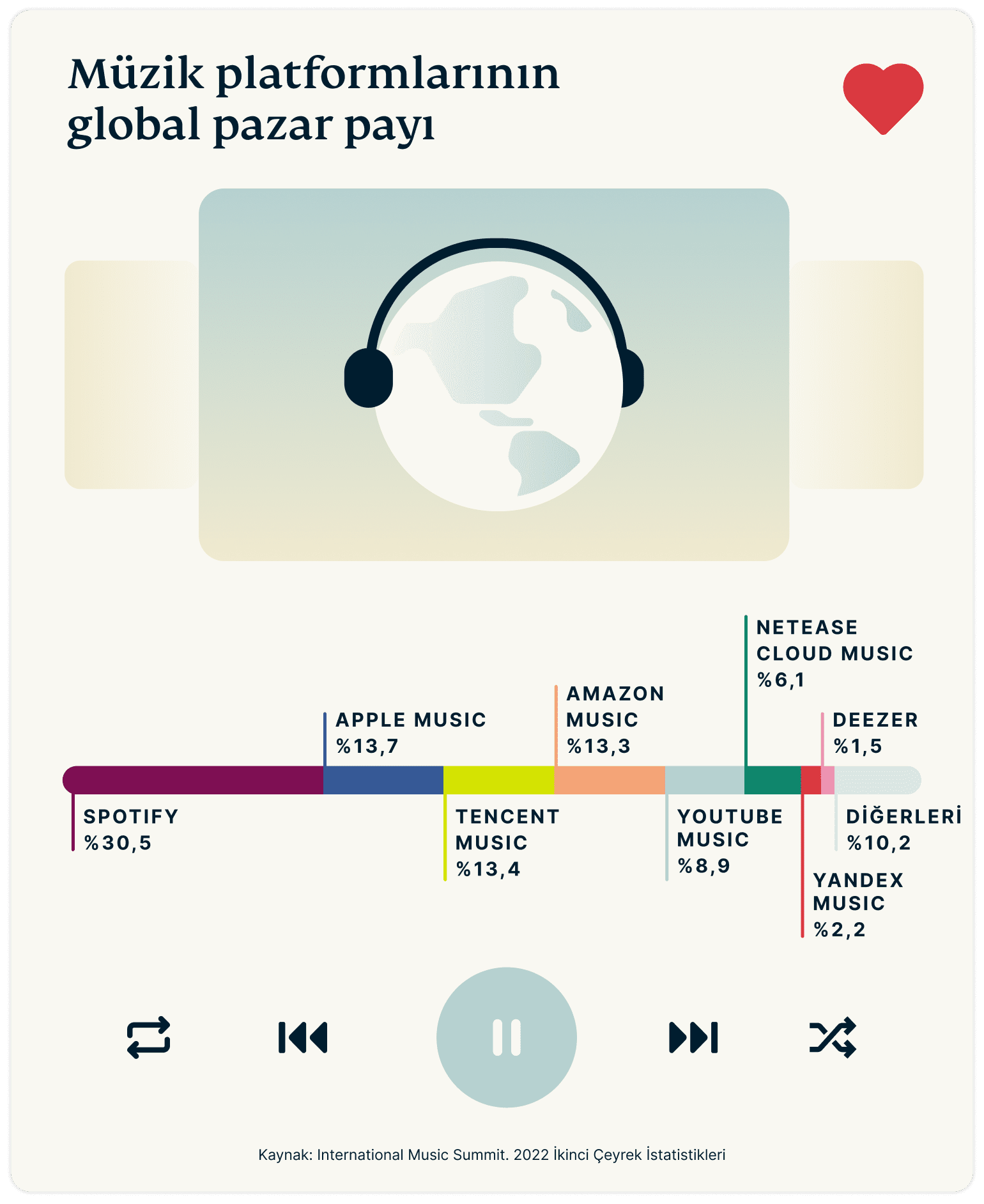 International Music Summit tarafından hazırlanan bir endüstri raporuna göre, Spotify müzik dünyasının tartışmasız lideri. 2022 itibariyle, Spotify'ın abone tabanı, müzik dünyasının %31'ine tekabül ediyordu. Bu sayının 2023 sonunda daha da yükselmesi bekleniyor. Onu %13.7'lik pay ile Apple Music ve %13.4 ile Tencent Music takip ediyor.